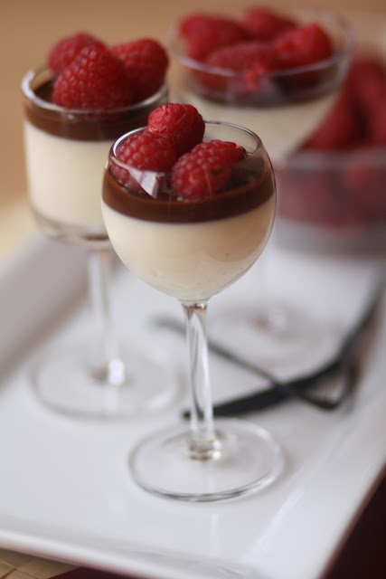 Yesterday, I made some more. This time, I wanted it vanilla and passionfruit flavored. I love the crunchy seeds of a passionfruit. But all three nearby supermarkets were out. So I resorted to making the panna cottas dark chocolate and raspberry flavored- which I don't regret one bit!